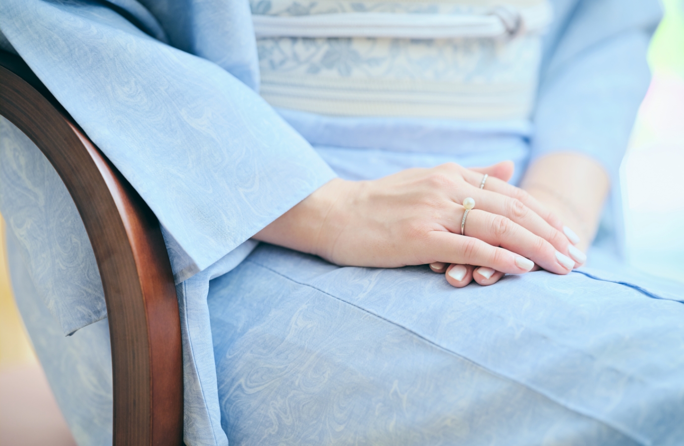 爽やかな着物にプラチナのジュエリーが加わると、さらに華やかになりますね。普段も着物にジュエリーを合わせることはあるのですが、着物の美しさが映えるよう、耳元のイヤリングなどさりげなく着けることが多いです。